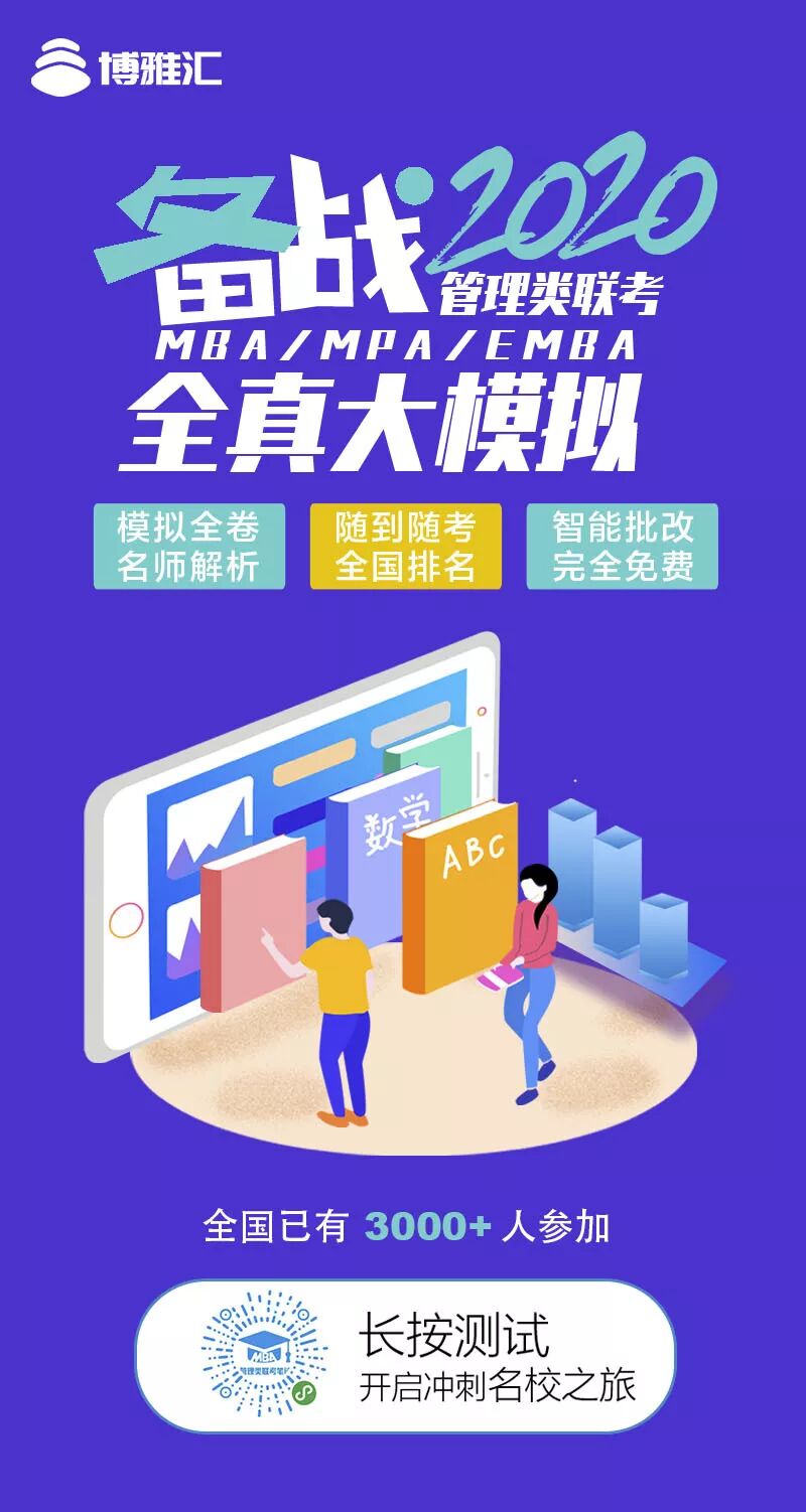 希望你通过【MBA联考摸底测试】小程序在线测试,可以认清自己现在的实力、科学规划、认真备考、直至顺利通过2020年联考。