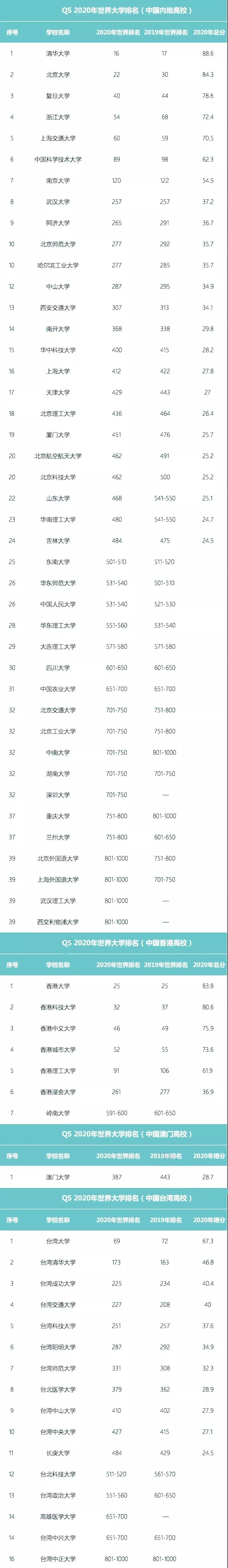 本次QS排名规则 就此次发布的2020年综合排名而言,共有6项指标被用于评估和检验全球顶尖高校的相关数据,这6项指标共包含了高校全球声誉,学术产出质量及影响力,国际化程度这三个大方面。具体为: 学术声誉 40% 雇主声誉 10% 每个教师的论文引用数量 20% 教师/学生比例 20% 国际教师比率 5% 国际学生比率 5% 本次排名详情 2020年排名中,麻省理工学院第8年蝉联第一,斯坦福大学、哈佛大学随后。中国大陆高校今年表现不俗,清华大学、北京大学两所顶尖大学在此次排名中取得了史上最高名次,分别排名全球大学第16位、第22位。 总体高校排名:麻省理工学院雷打不动的第一,完整版TOP200排名可以在咱们公众号【田然MBA】回复:QS 世界排名前20的高校 中国大陆高校排名:25所较去年排名上升 亚洲方面,排名最高的大学为新加坡国立大学和南洋理工大学(并列世界第11位)。清华大学、北京大学两所高校分别位列第16和第22,这也是目前为止清华与北大在QS世界大学排名中取得的最好成绩。 中国大陆高校在此次排名中表现突出的还有复旦大学、浙江大学、上海交通大学、中国科技大学,都跻身进入全球前100名,从榜单上可以看出,整个中国大陆教育系统的持续进步。 以下是QS中国所有上榜高校名单,大陆加上港澳台地区共计66所高校,比去年新增一所,其中大陆地区为39所高校。大家可以作为择校的辅助参考。