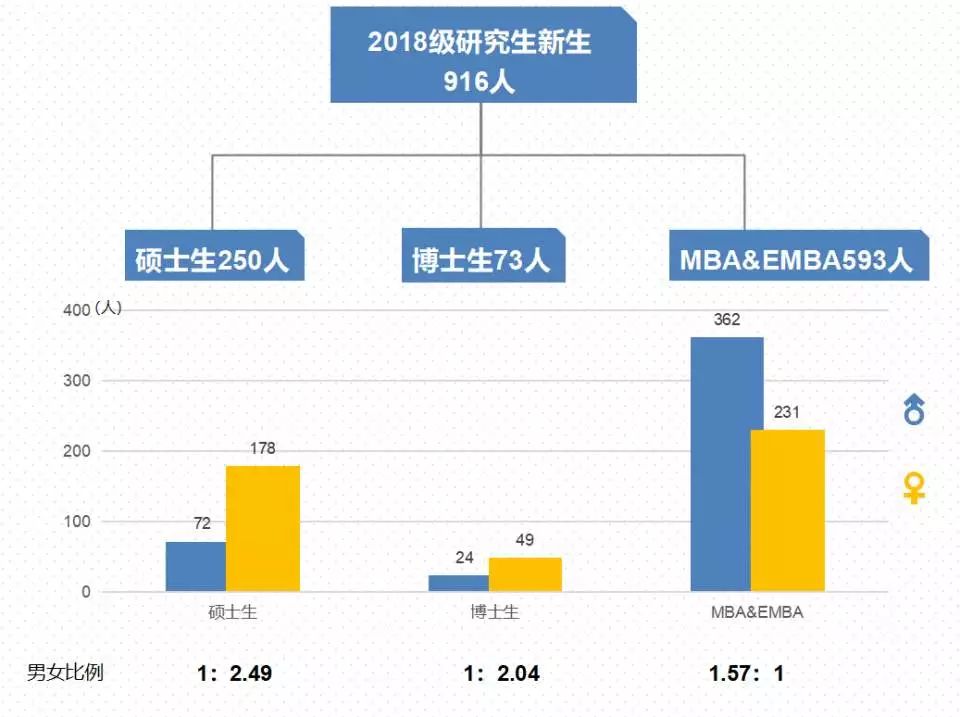 2018年,人大商学院共录取研究生新生916人,其中,硕士(学术型、专业型)250人,博士73人,MBA427人,EMBA166人。MBA&EMBA学生中男女比例为1.57:1。