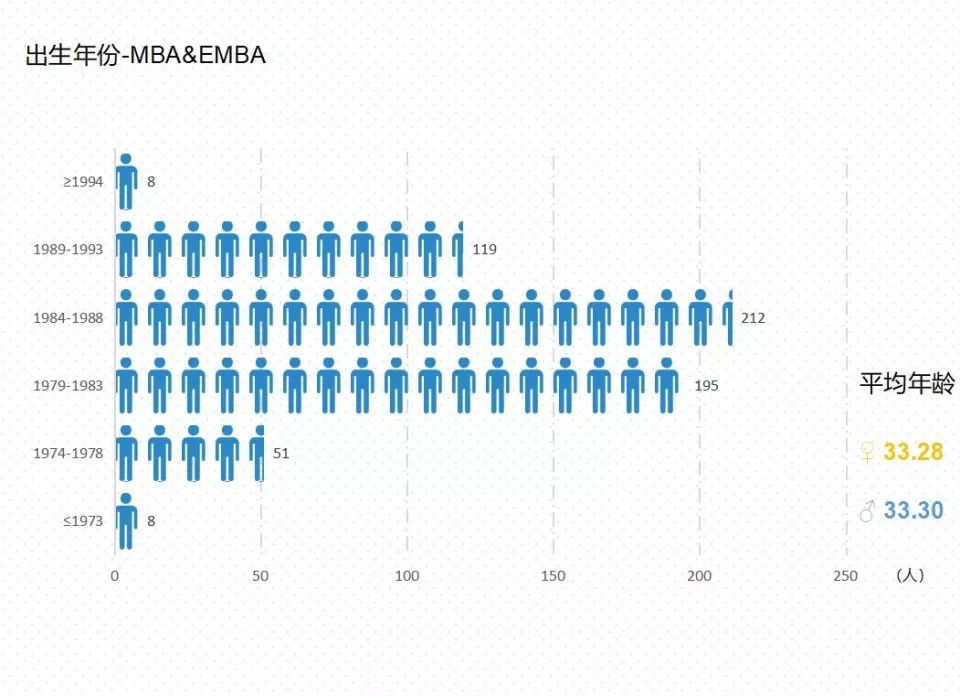 MBA学生的平均年龄为32.50岁,EMBA学生的平均年龄为36.13岁;总体平均年龄为33.52岁。