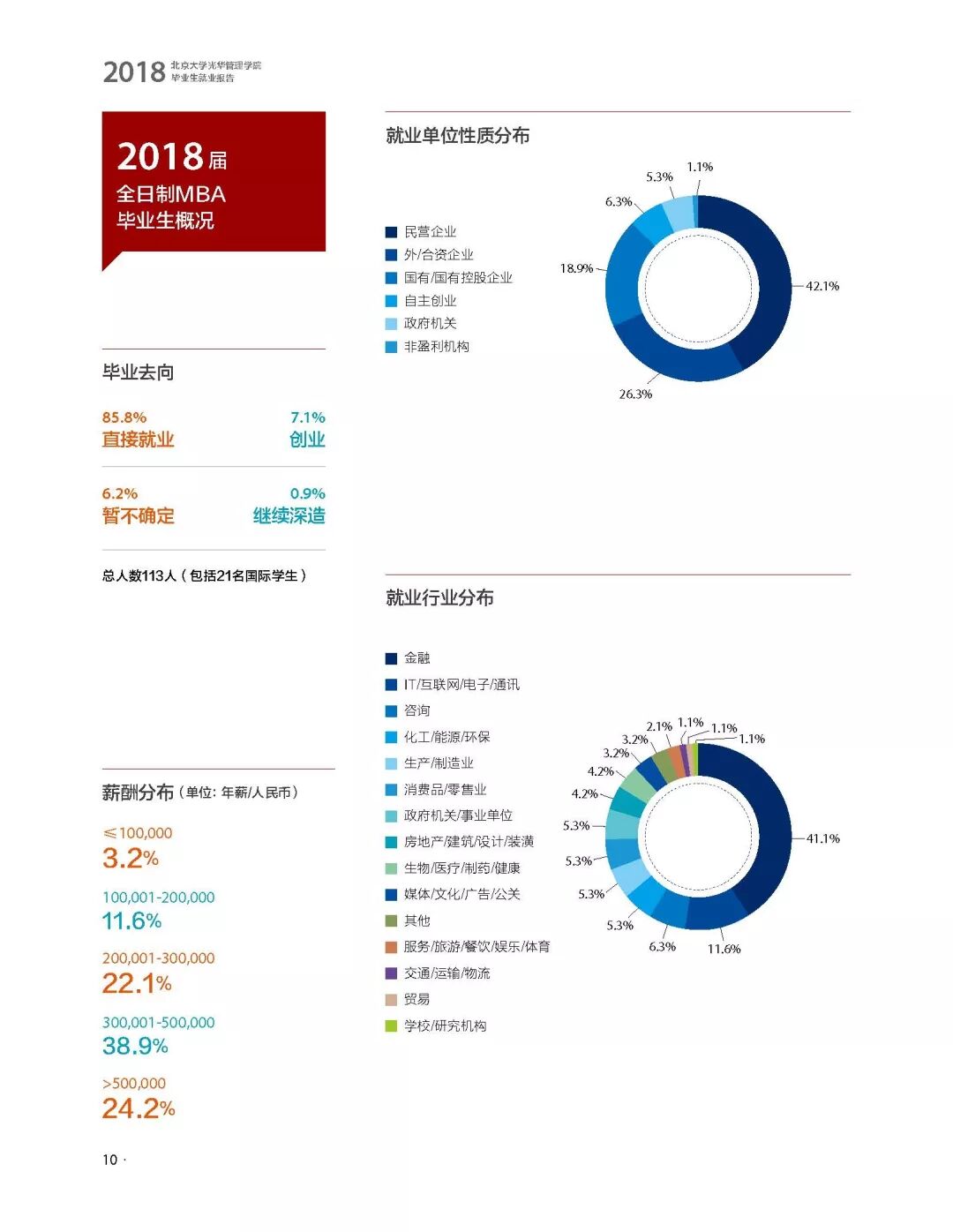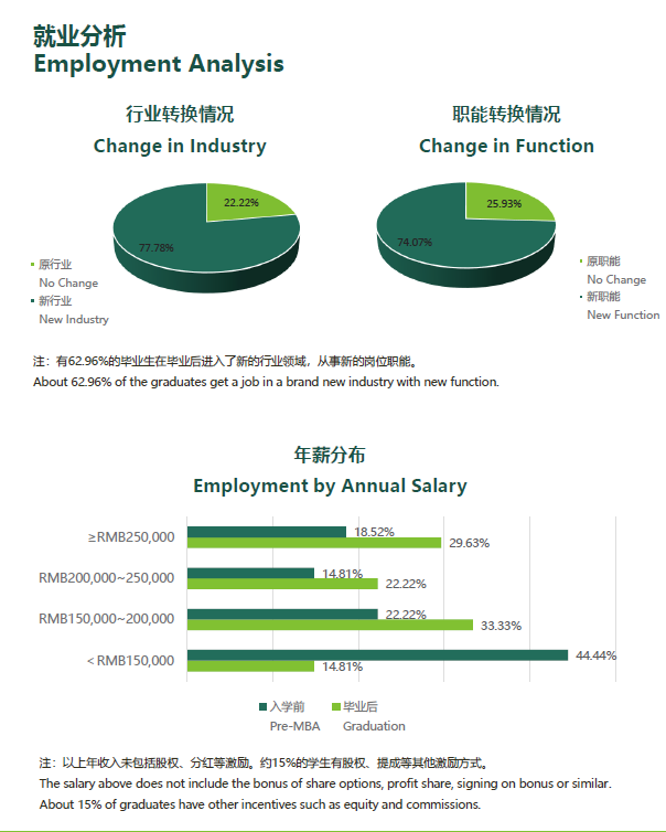 本届毕业生年薪资中位数达到人民币50万元,其中超六成毕业生年薪在30万元到60万元之间,较MBA入学前平均增长95.0%。