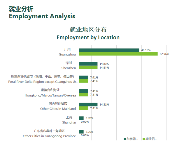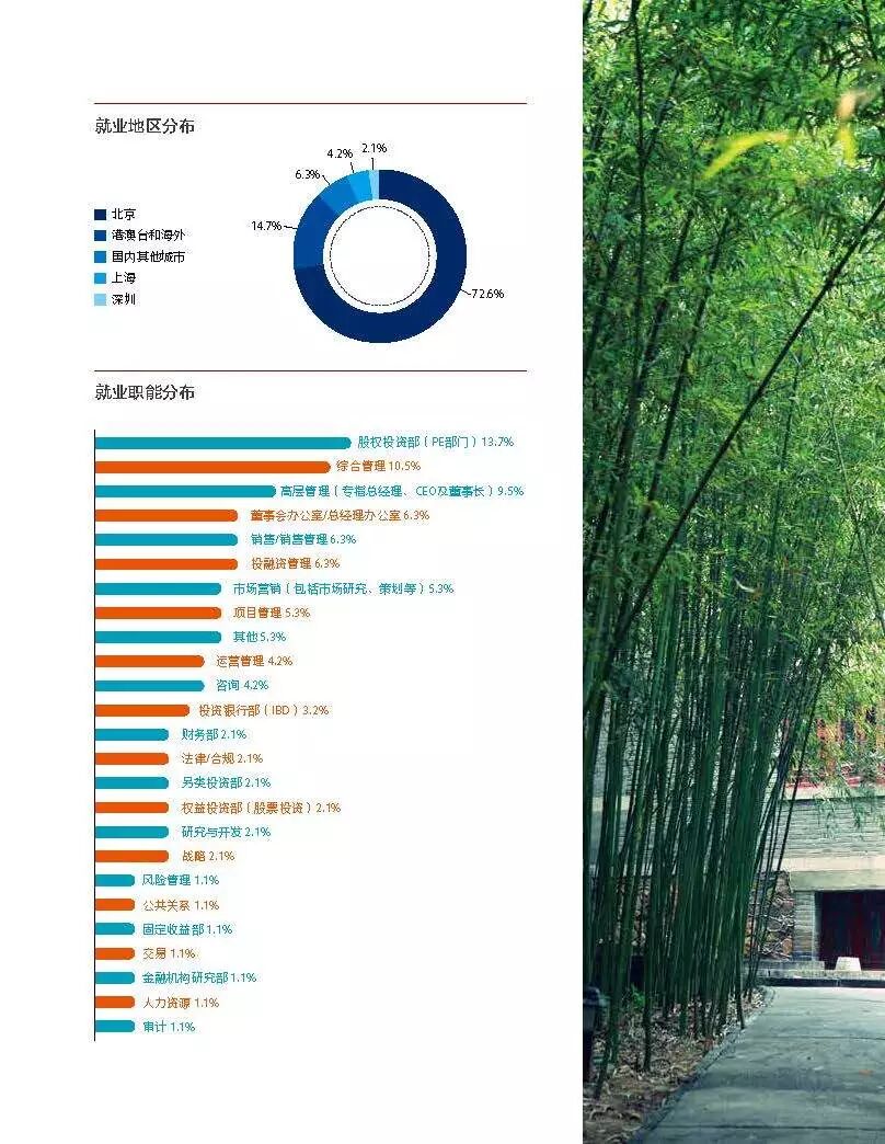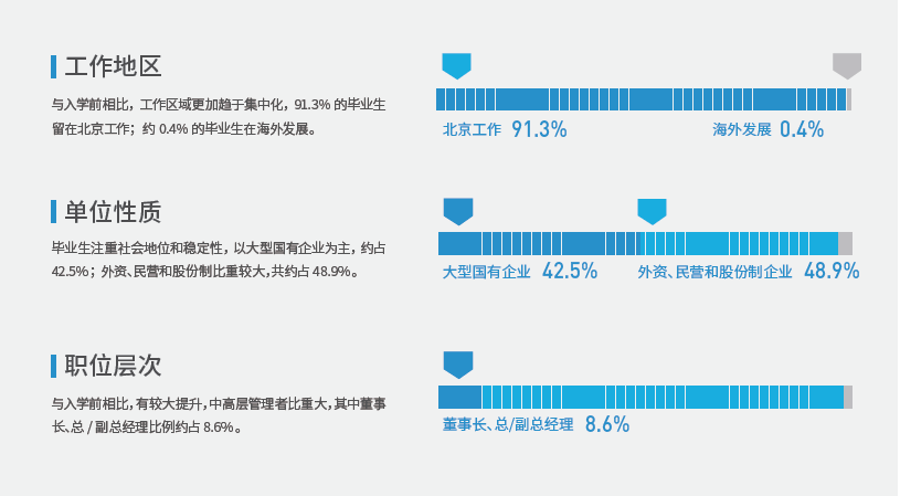 与入学前相比,工作区域更加趋于集中化,91.3%的毕业生留在北京工作;约0.4%的毕业生在海外发展。
