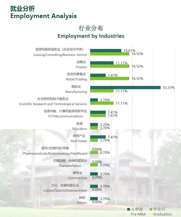 金融服务、房地产/建筑最为热门,金融服务的比例由入学前的21.7%飙升至毕业后的53.3%