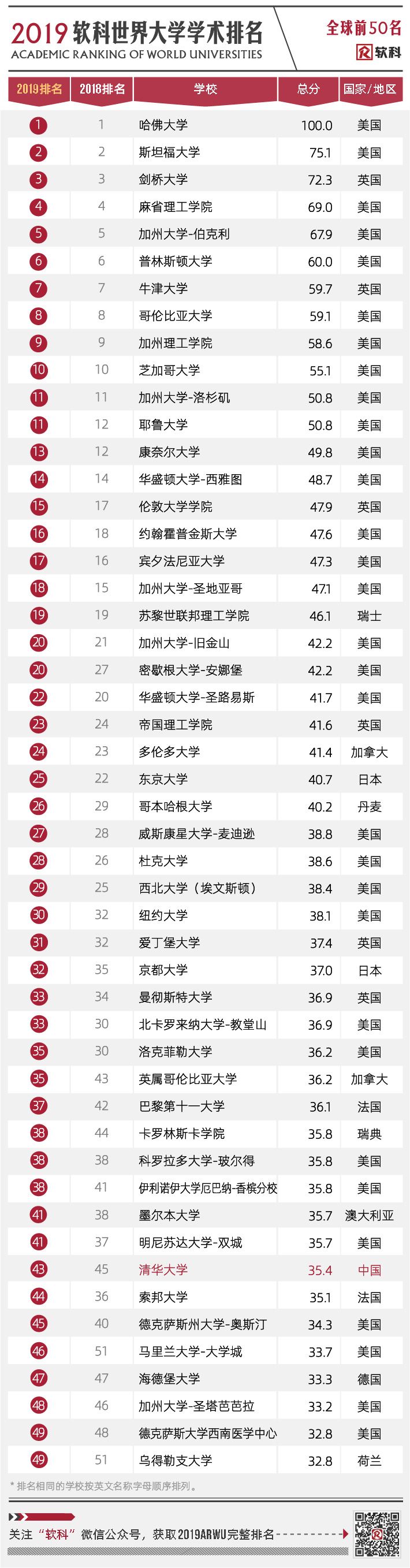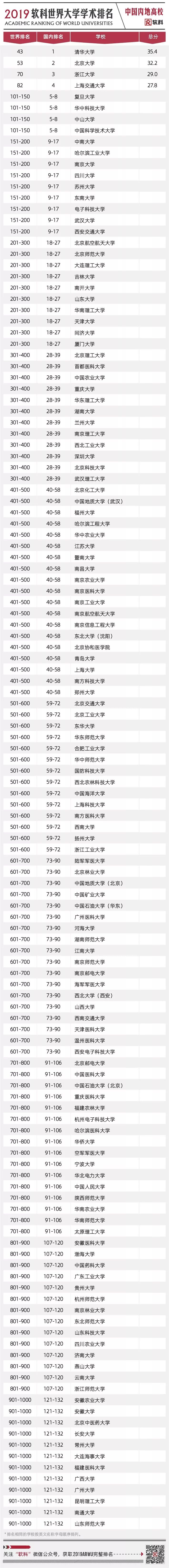 2019软科世界大学学术排名于2019年8月15日18时正式发布。排名展示了全球领先的1000所研究型大学,中国内地共有132所大学上榜,清华大学排名世界第43,北京大学位居世界第53,浙江大学位居世界第70,上海交通大学首次跻身世界百强,位列世界第82。