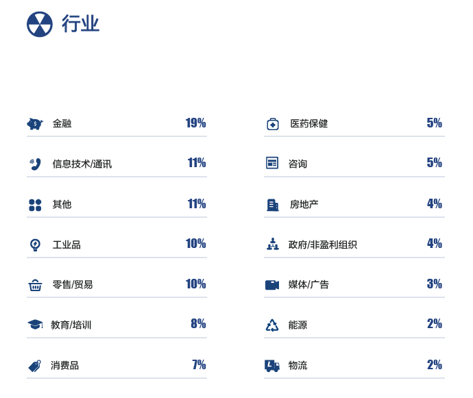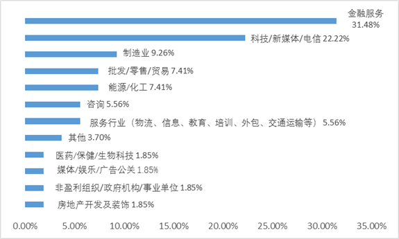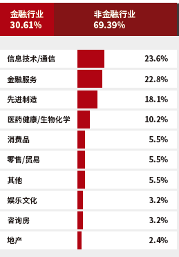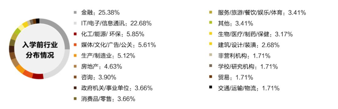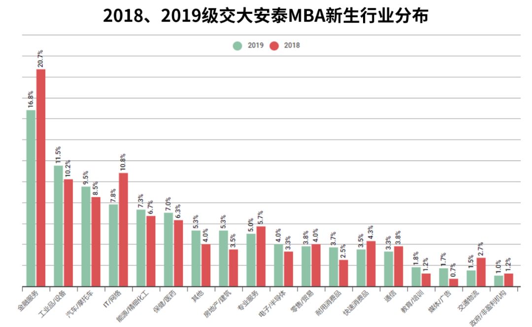 行业分类 清华MBA在职项目中,学生从事金融服务行业占比27.68%和科技/新媒体/电信类行业占比21.43%位列前两名,基本占据了一半的考生总人数。随后是制造业、房地产开发及装饰分别占比8.93%和8.63%。 2019级清华-MIT全球MBA项目 行业分类 在清华-MIT全球MBA项目中,学生从事金融服务行业占比31.48%,科技/新媒体/电信类行业占比22.22%,这两个行业跟清华MBA在职项目很相似,都占了很大的比例。随后是制造业以9.26%的占比排到第三位。 北京大学 2019年北大MBA录取学生(全部) 行业分类 在北大MBA录取的学生中,从事金融行业占比25.38%、IT/电子/信息通讯行业占比22.68%位列前两名,这两个行业学生加起来基本占据了一半的考生总人数,这一情况和清华MBA项目基本类似。 化工/能源/环保行业,媒体/文化/广告/公关行业,生产/制造行业分别以5.85%、5.61%、5.12%的占比位列第三四五位。 复旦大学 2018级复旦MBA项目 复旦MBA项目学生从事金融行业占比27%,工业品行业占比20%,信息技术/通讯类行业占比10%,这三个行业从业者共占据了57%的比例。 2018级复旦国际MBA项目 复旦国际MBA项目,学生从事金融行业占比19%,信息技术/通讯行业占比11%,这两个行业从业者共占据了30%的比例。 上海交通大学 04 上海交大安泰MBA项目 行业分类 以2019级交大安泰MBA新生数据来说,学生从事金融服务行业占比16.8%,工业品/设备行业占比11.5%,汽车/摩托车行业占比9.5%,IT/网络行业占比7.8,能源/精细化工行业占比7.3%,保健/医疗行业占比7.0%,这六大行业从业者占据59.9%的比例。 上海高级金融全日制MBA项目 行业分类 上海高级金融在职MBA项目 行业分类 上海交通大学上海高级金融学院FMBA项目是中国首个金融专业方向的工商管理硕士学位项目,其定位就是培养通晓现代金融知识的领军人才,所以占比较高。全日制项目从事金融行业占比较小,是因为很多人本身在其他领域,想通过MBA来实现向金融行业的转型。 总结: 综合国内这几所顶尖院校MBA项目的的学生背景来看,从事金融相关行业、电子科技行业、信息通讯行业的学生是最多的,其次在工业、能源、房地产、保健医药、教育也有一定的比例。 看到这的你,是属于哪个行业呢?你有在备考,还是说只是观望呢?如果你是上面这几个行业的从业者,正好处于瓶颈期想要突破谋求更好的发展,那读MBA绝对是一个非常好的选择。
